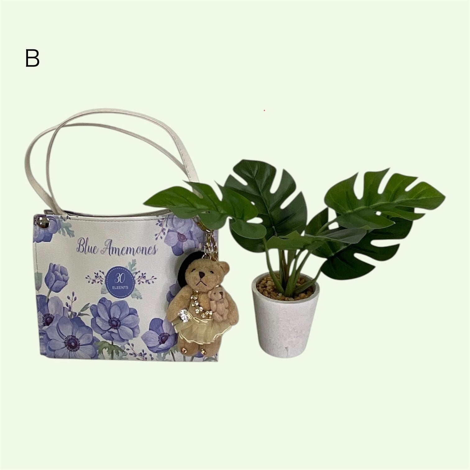 上品なローズプリントのミニバッグに、インテリアに映えるフェイクミニ観葉植物をセットにしました。